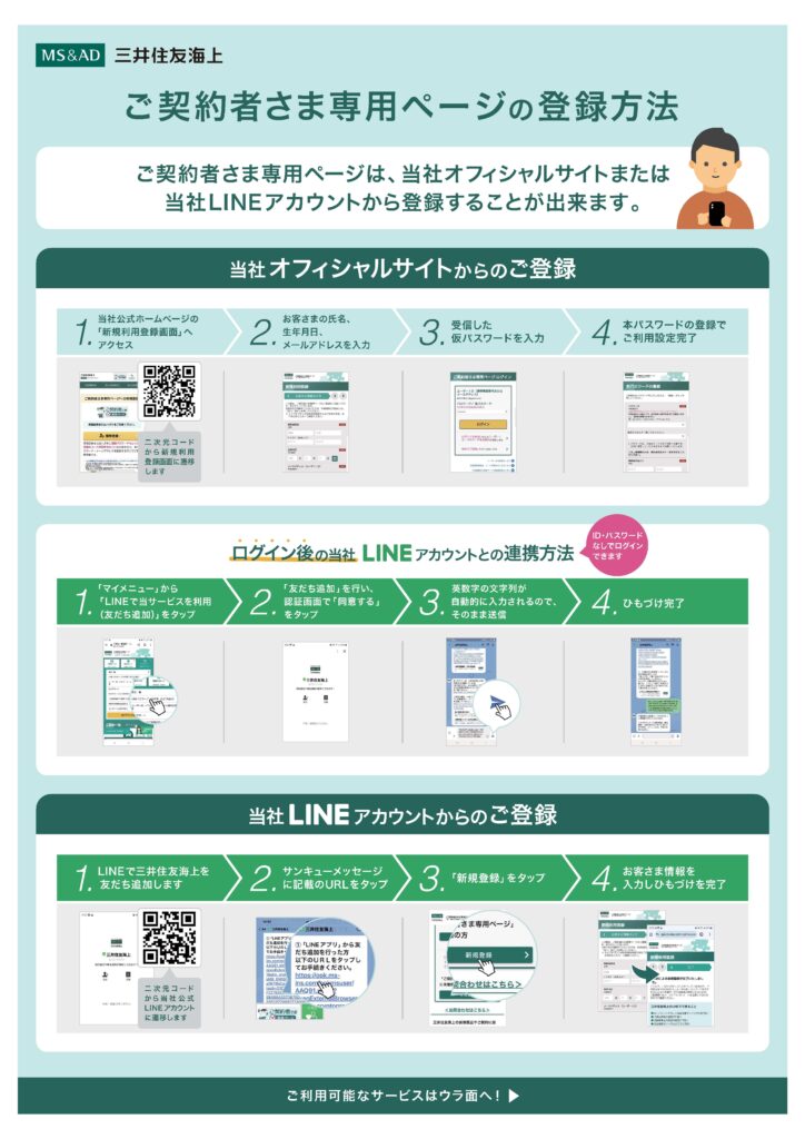 ことで、お客さまご自身でご契約の内容のご確認ができたり、実際事故等が起こった際に、保険会社への連絡がスムーズにおこなうことができます。